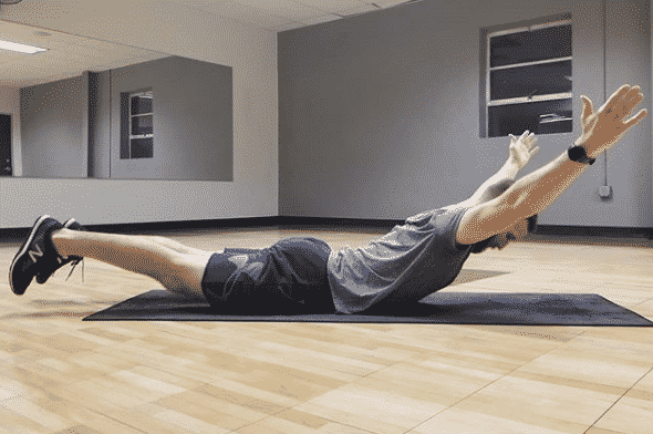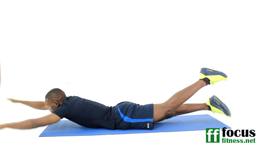 Lie face down on the ground with your arms out straight overhead on the ground and your legs out straight behind you. Perform one set of 5 repetitions. This exercise is held for 30 seconds or more. The superman exercise primarily targets the erector spinae, or the three long muscles that surround the spine.. Exhale as you lower back down.