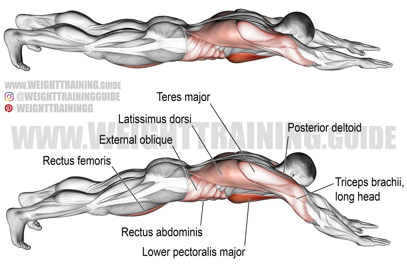 This group of muscles includes (outside to inside):.. Slightly bend your knees and reach forward with your left arm. To do the basic superman exercise: Facedown on your mat with limbs outstretched. This exercise is held for 30 seconds or more. Superman exercise trains the fitness of the following muscle groups:.. Muscles trained with superman exercise.